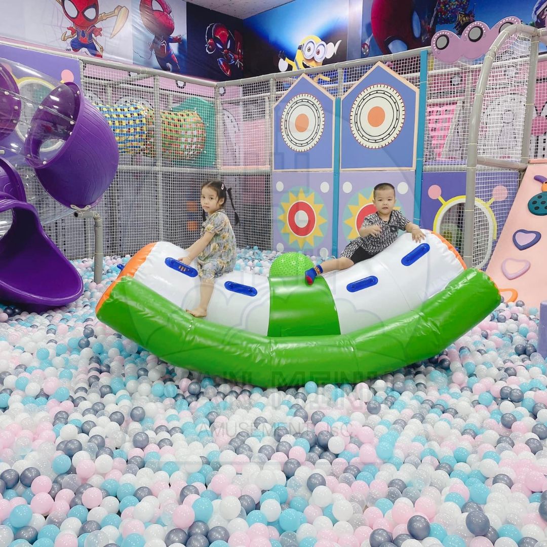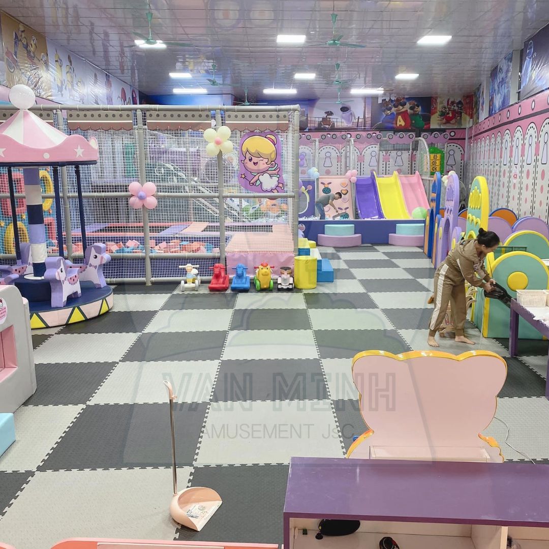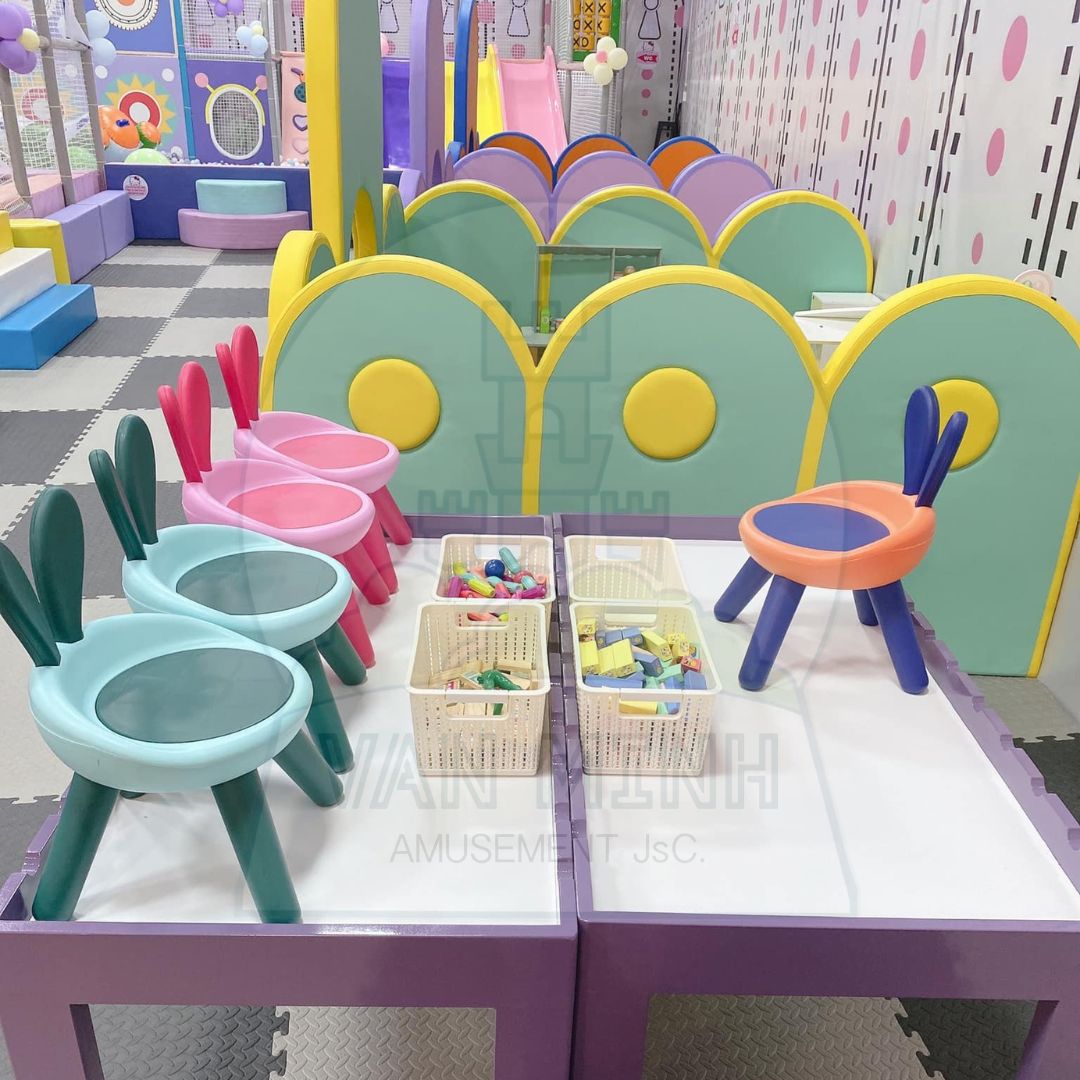 Khu vui chơi được thiết kế với tone màu nhẹ nhàng, mộng mơ cho các bé. Điểm nhấn của khu vui chơi là hệ cầu trượt gồm 4 máng trượt cùng với tổ hợp vận động sàn bật hấp dẫn.