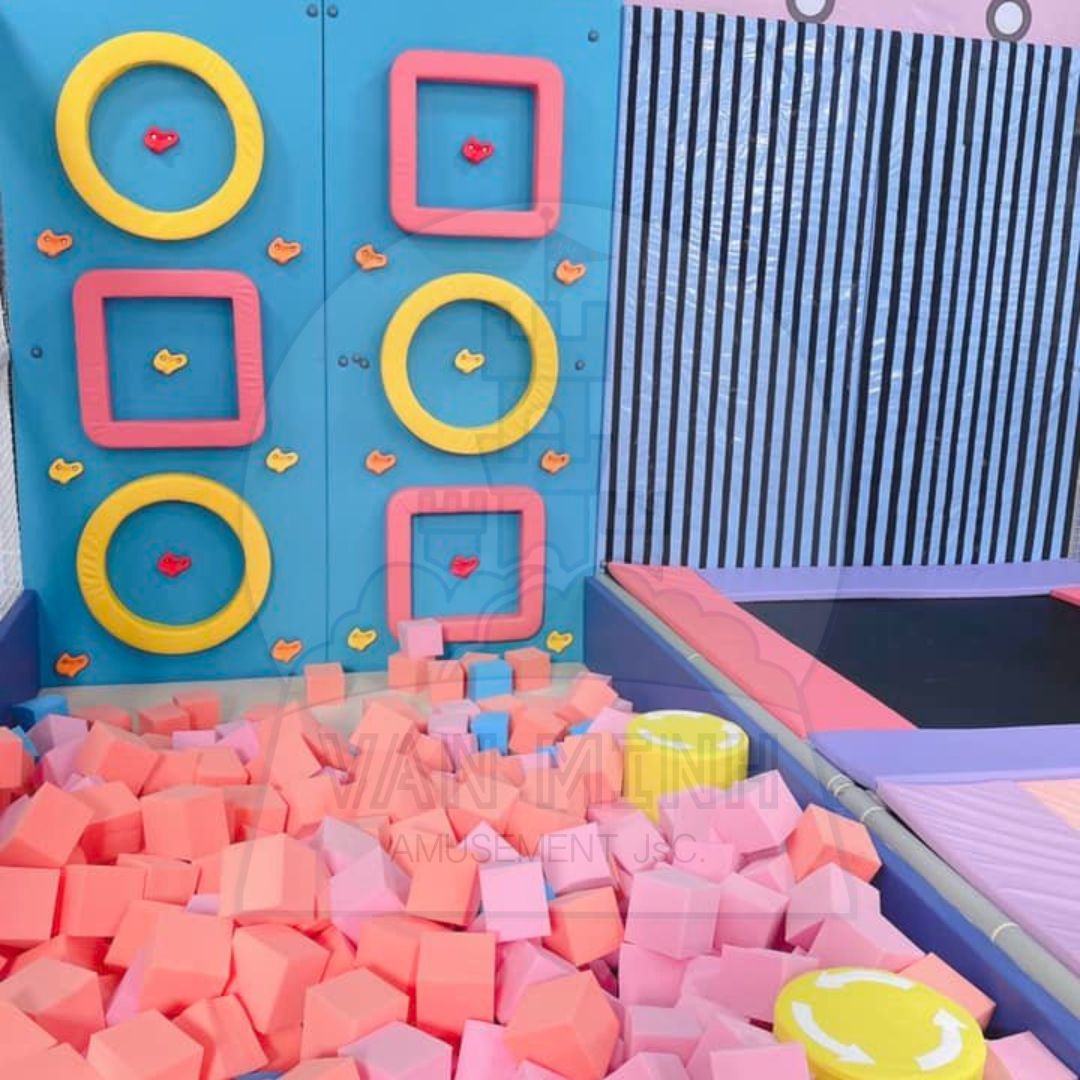 Khu sàn bật kết hợp hố xốp và leo núi tường hấp dẫn cho các bé.